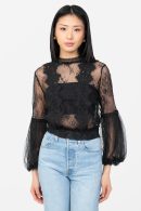 The Clara Mesh Lace Crop Blouse is the fabric personification of ‘enchanting’. With dreamy lace details featured along the front princess seams. The mesh bodice highlights a sheer fabric throughout and sleeves to match. With cinched details along the mock neck, hem and sleeve cuffs. This magical number is fit for a princess!