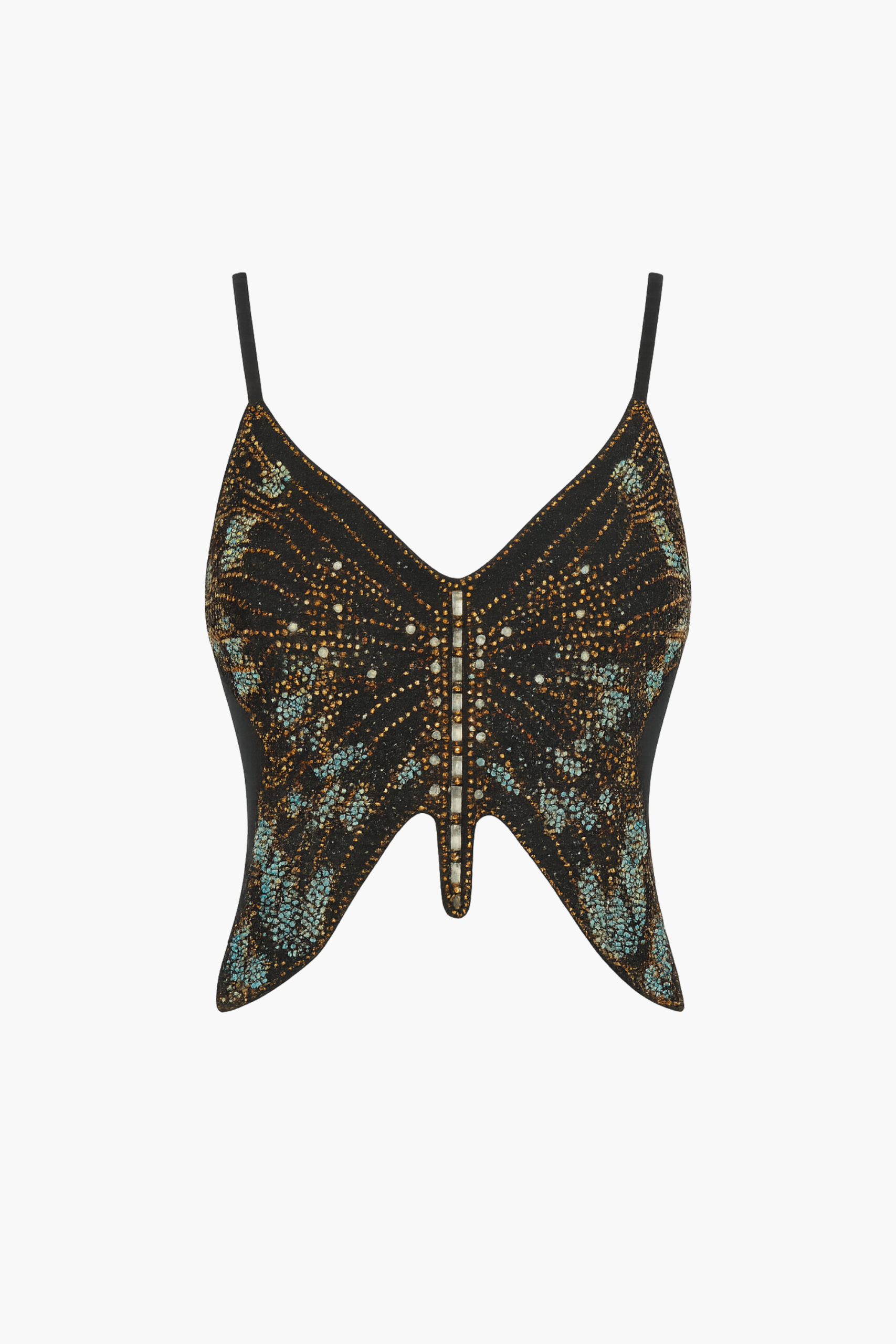 The Fiorina Rhinestone Butterfly Top isn’t just a piece—it’s the main event. Featuring an intricately beaded rhinestone butterfly design and a sculpted fit, it’s made to catch the light (and attention) from every angle. The delicate straps balance the statement shape and the sheer mesh back adds the perfect contrast. Made for nights out, festival looks, or any moment you want to feel unforgettable.