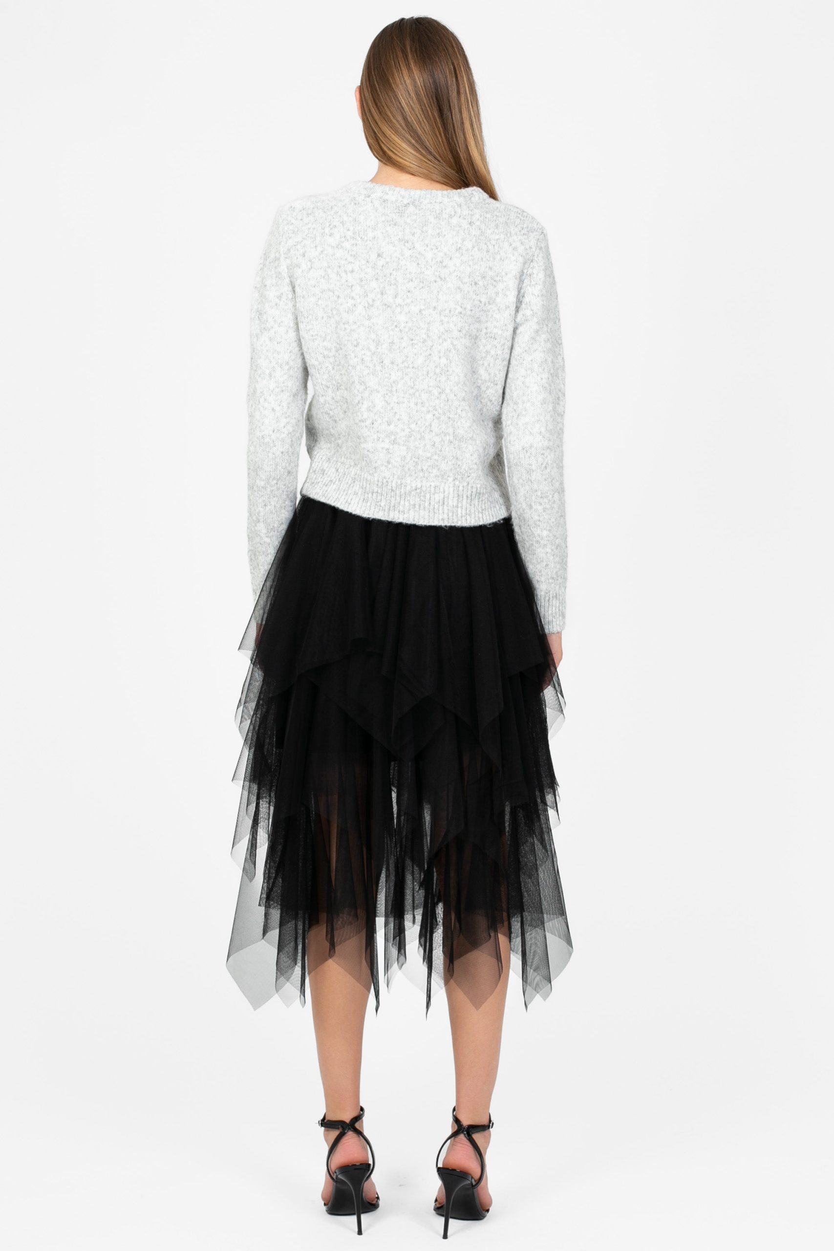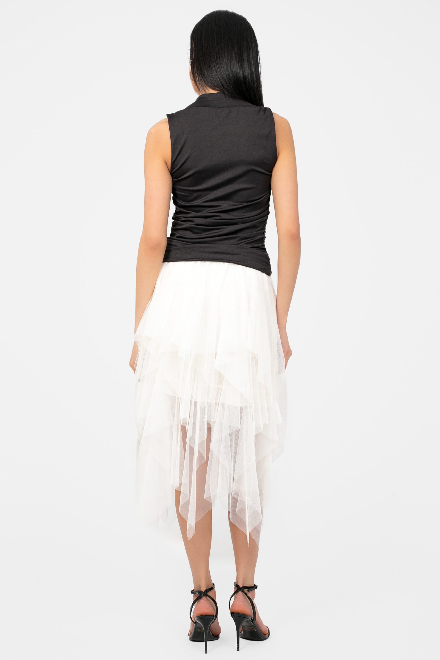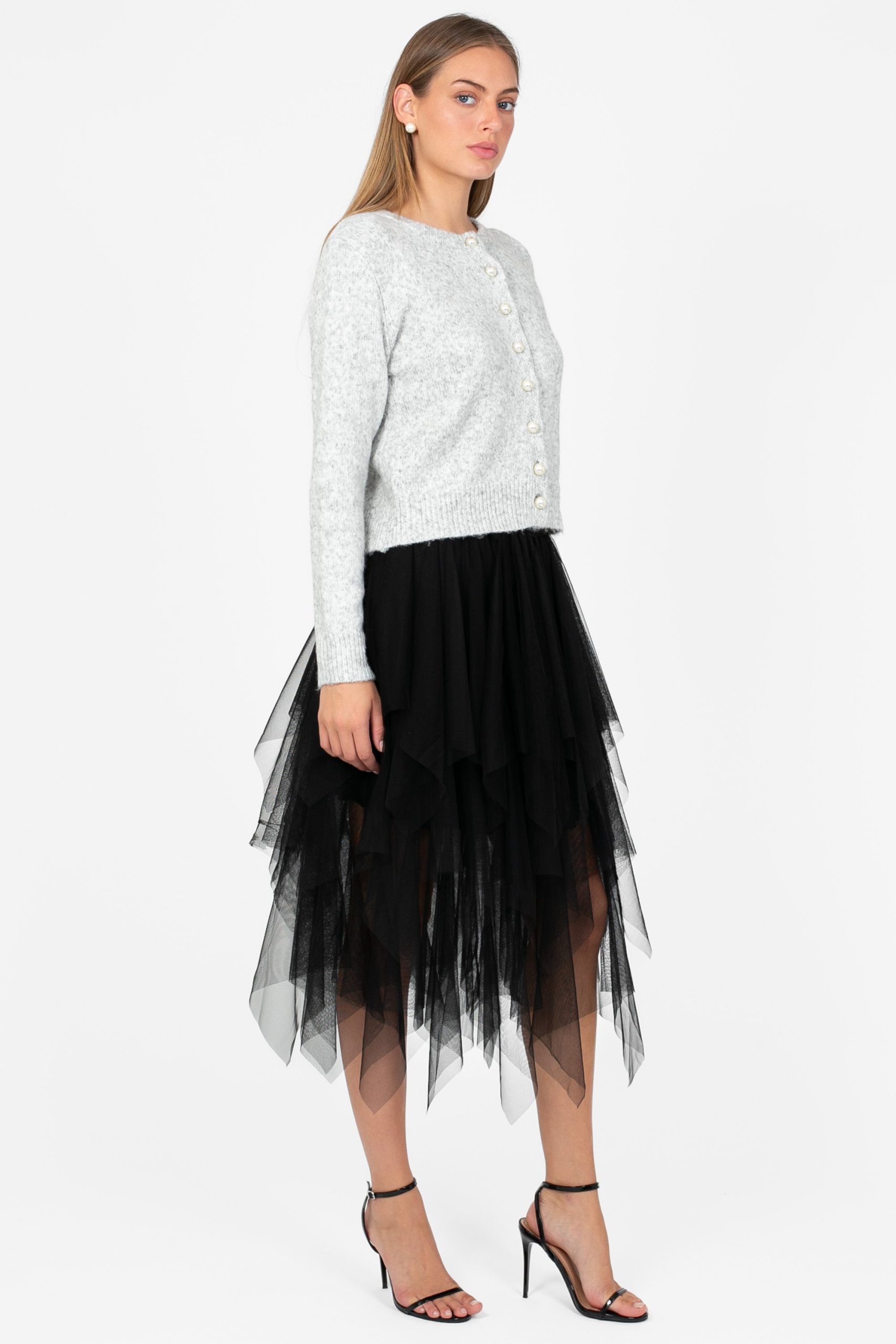 Elevate your wardrobe with the Violetta Multi-Layer Tulle Midi Skirt, a piece that combines elegance and drama in perfect harmony. This skirt features a stunning high-waisted design that accentuates your silhouette, while the cascading layers of soft, flowing tulle create a voluminous and enchanting effect. The intricate layering adds movement and dimension, making every step feel like a moment on the runway.